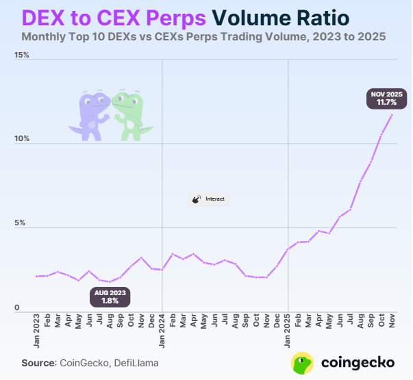 O avanço não ficou restrito ao mercado à vista. O segmento de derivativos também registrou crescimento acelerado, com os perpétuos negociados em DEXs alcançando recordes próprios e ampliando sua presença frente às exchanges centralizadas. A participação desse mercado já se aproxima de 12%, indicando que a infraestrutura descentralizada começa a competir de forma mais direta com plataformas tradicionais também no trading alavancado.