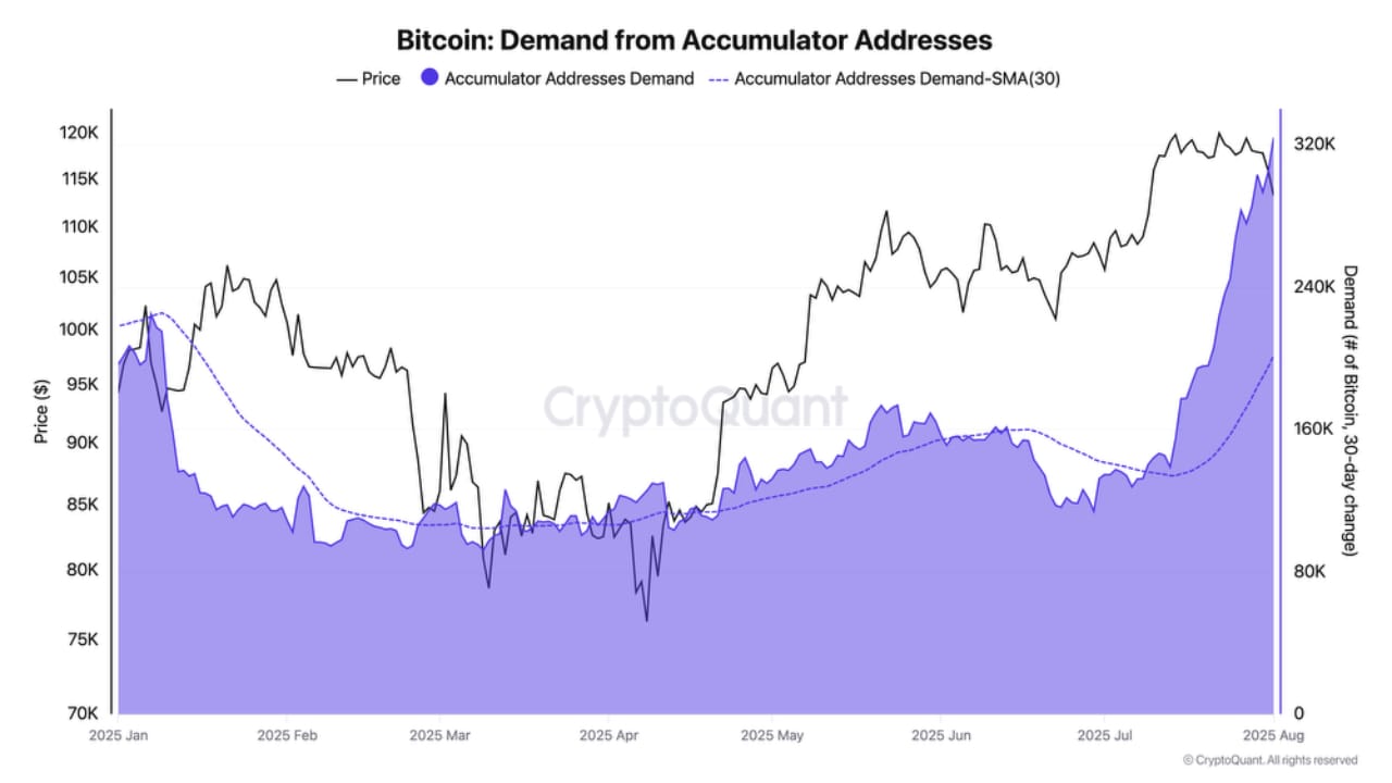 🔹 Endereços acumuladoresA análise dos endereços que apenas compram BTC — sem nunca vender — revela ainda mais convicção no comportamento dos investidores. Nessas carteiras, o acúmulo médio de BTC subiu cerca de 50 mil unidades no último mês, demonstrando uma postura consistente de compra e confiança no ativo.