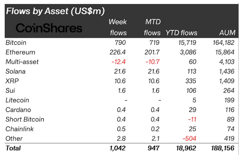 Os produtos de investimento em criptoativos tiveram entradas semanais superiores a US$ 1,05 bilhão, elevando o total de ativos sob gestão (AUM) para um recorde histórico de US$ 188 bilhões, segundo o mais recente relatório da CoinShares.