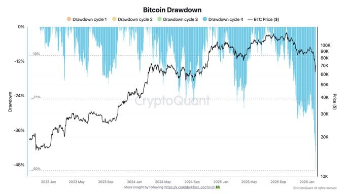 Os últimos dias foram especialmente duros para o Bitcoin e para o mercado cripto como um todo. Em 6 de fevereiro, o BTC voltou a ficar abaixo de US$ 60.000, nível que não era testado desde outubro de 2024. Ao mesmo tempo, o mercado registrou uma correção superior a 50% em relação ao último topo histórico, reacendendo o medo entre investidores e intensificando a pressão vendedora.