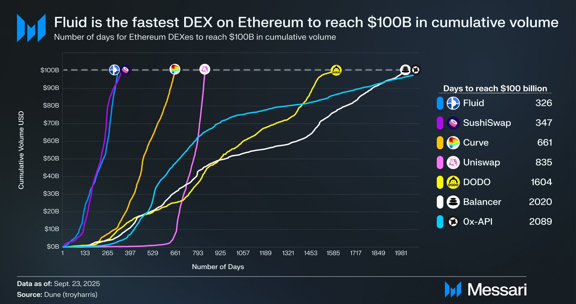 A Fluid conquistou um marco histórico ao se tornar a DEX mais veloz do Ethereum a alcançar US$ 100 bilhões em volume cumulativo, segundo dados da Messari. O feito foi atingido em apenas 326 dias desde seu lançamento em 2024 — superando nomes tradicionais do setor como SushiSwap (347 dias), Curve (661 dias) e Uniswap (835 dias).