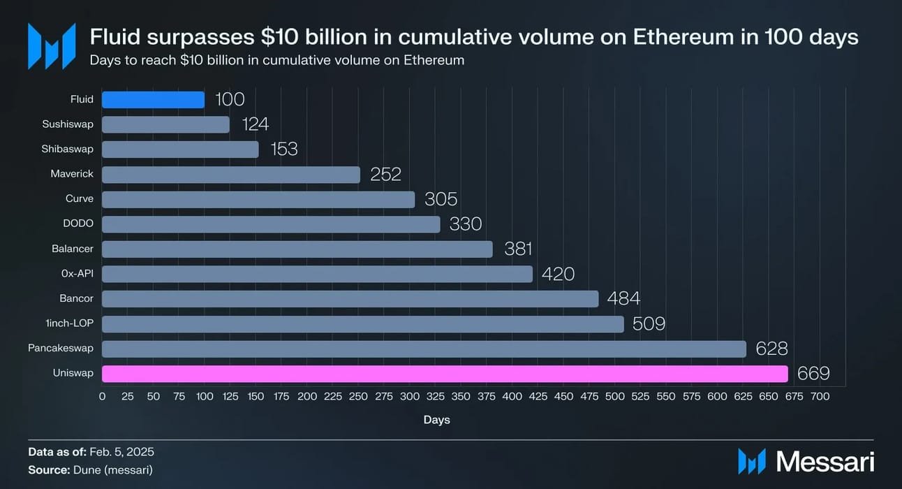 Fluid, protocolo descentralizado desenvolvido pela Instadapp, alcançou recentemente a marca de US$ 10 bilhões em volume de negociação na rede Ethereum, tornando-se o protocolo mais rápido a atingir esse marco.